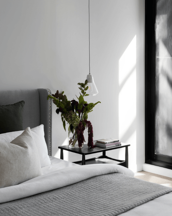 Über die moderne Stahl-Wangen-Treppe mit Massivholzstufen nach oben gelangt, betritt man den 10 m² großen Flur, der alle weiteren Zimmer erschließt; so z.B. das ca. 25 m² große Schlafzimmer. Dieses bietet viel Komfort, wozu das Ankleidezimmer – hinter einer Trennwand gelegen – seinen entscheidenden Teil beiträgt.